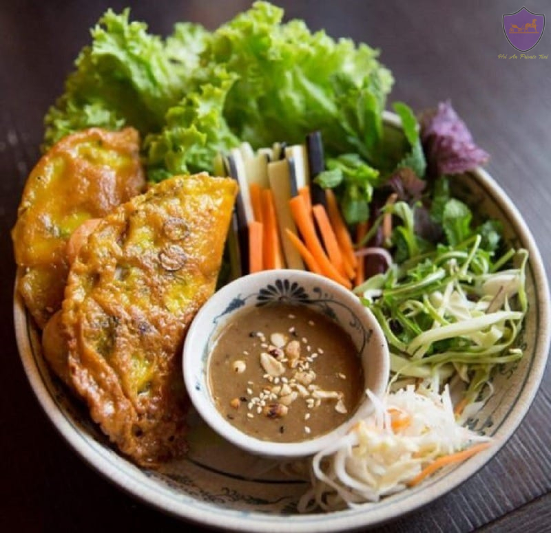 From bean sprouts, lettuce, herbs, and lettuce to bananas, figs, and star fruit. When eating, just put each raw vegetable in turn in a banh khoai, dip it in the fat and aromatic Hue peanut dipping sauce, and then just want to eat forever.